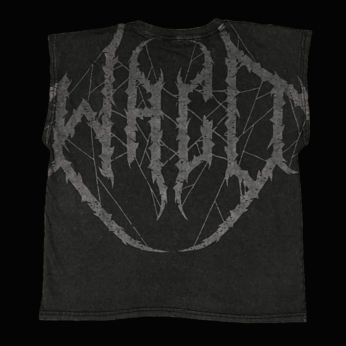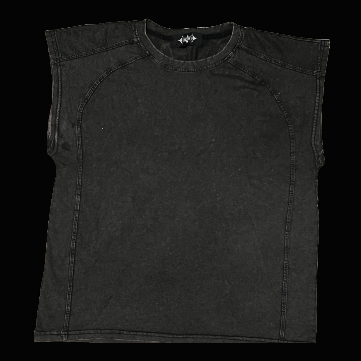 Cropped, sleeveless, and washed in acid like it came through a wreckage. Dreadnought is cut from 210GSM heavyweight jersey, 100% cotton. Lightweight enough to move in, heavy enough to carry meaning. Your summer blackout uniform.